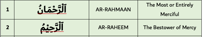 - Recite the first two names: Look and recite Ar-Rahman, Ar-Raheem. Slowly, clearly 5 times. Try to look at the Arabic first and on the 4th time you can let your eyes wonder to the meaning. Then cover the names with your hand or close your eyes and picture the names and recite 3 times without looking Ar-Rahman, Ar-Raheem.